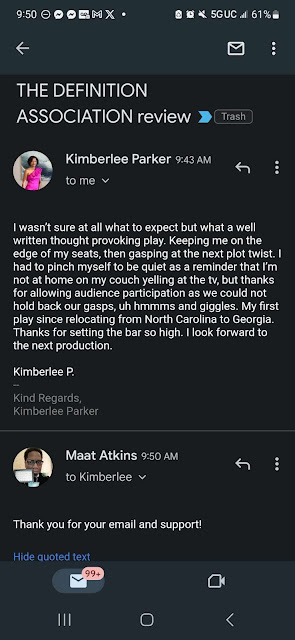 HERE ARE SOME RECENT REVIEWS OF THE DEFINITION ASSOCIATION FROM AUGUST AND NOVEMBER 2023 RUNS AT PUSHPUSH ARTS IN COLLEGE PARK, GA.